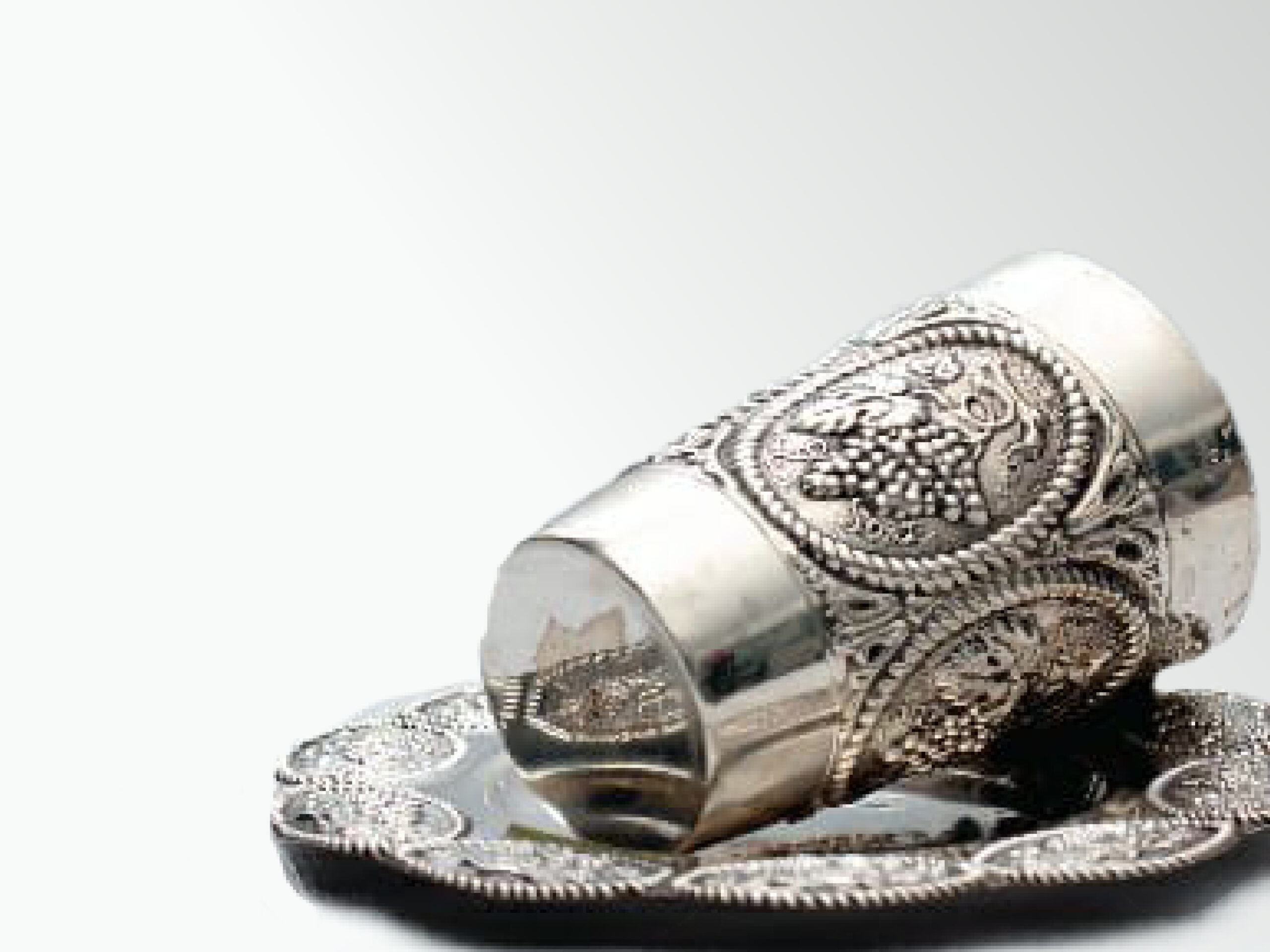 גביע הכוס רקוע בעבודת יד בסגנון עיטורים + צלחת מכסף טהור תואמת לגביע. משקל הגביע: 109 גרם משקל הצלחת: 47 גרם גובה הגביע: 16 ס"מ...